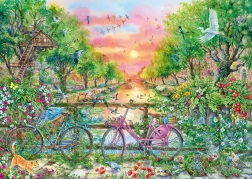 Une scène romantique au bord du canal avec vélos, fleurs et coucher de soleil apporte une atmosphère sereine et la joie d’un tableau terminé.