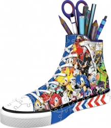 Découvrez le puzzle 3D Ravensburger en forme de basket avec le motif de Sonic le hérisson, qui peut servir de porte-stylo, crayons ou pinceaux original. L'assemblage est facilité par des pièces spéciales incurvées et flexibles qui s'emboîtent parfaitement, créant ainsi une construction solide et stable sans nécessiter de colle.