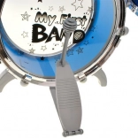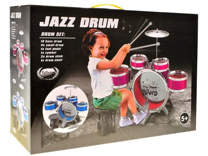 Le pack comprend une grosse caisse avec pédale, deux toms moyens et deux petits fûts, une cymbale métallique, un tabouret et une paire de baguettes. L’ensemble est livré dans une boîte en carton et prêt à réjouir chaque jeune batteur.