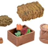 Figurine de fermier, brouette, râteau, fourche et autres accessoires pour des travaux de ferme réalistes.