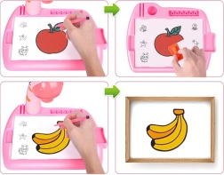 Les diapositives interchangeables proposent une grande variété de motifs d’animaux, de véhicules, de fruits et de légumes, permettant aux enfants d’exercer non seulement leur motricité fine, mais aussi la reconnaissance des formes et des couleurs. L’ensemble de 12 feutres colorés, le bloc de dessin et les porte-accessoires gardent tout bien organisé à portée de main.