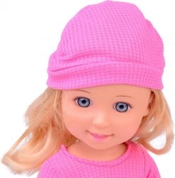Le chemisier rose, la jupe violette et le bonnet rose donnent à la poupée une allure élégante, idéale pour les jeux de mode.