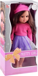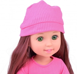 Poupée aux longs cheveux bruns, portant un bonnet rose et une jupe violette, c’est un jouet stylé pour enfants. Membres articulés pour un jeu créatif et apparence réaliste qui captive les jeunes propriétaires.