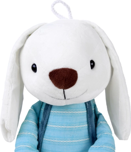Adorable lapin en peluche en salopette d’une hauteur de 60 cm, fabriqué dans un matériau très doux, avec des yeux en plastique, un petit nez brodé et un joli sourire. Un super compagnon pour jouer, s’endormir et partir en balade.