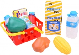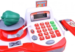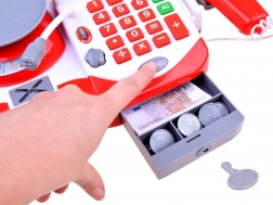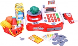 - Caisse avec calculatrice, scanner, balance et microphone; panier; pièces et billets en euros; carte de paiement; imitations d’aliments (poulet, maïs, poivron, eau, ketchup, lait)