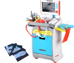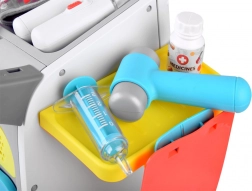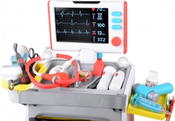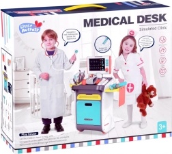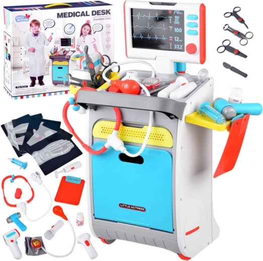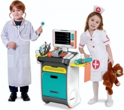Set médical complet pour enfants sur chariot roulant offrant un jeu de docteur réaliste dès 3 ans. Inclut des instruments interactifs, un moniteur ECG/RTG avec son, une machine à laver et un stérilisateur d’instruments, des étagères et tiroirs de rangement et une toise jusqu’à 112 cm. Sa conception solide et ses couleurs vives encouragent un jeu créatif et éducatif.