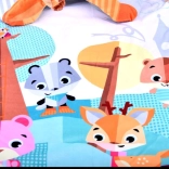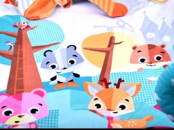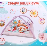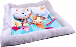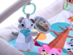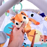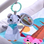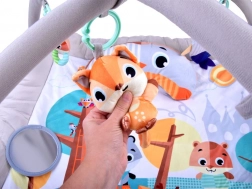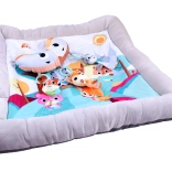 Le set comprend des animaux en tissu avec diverses textures et sons, un soleil à mélodie apaisante, un miroir et un coussin doux pour soutenir la tête ou pendant le temps sur le ventre. Le tapis encourage la reconnaissance des formes et des couleurs, l’apprentissage cause–effet et la coordination des mouvements.