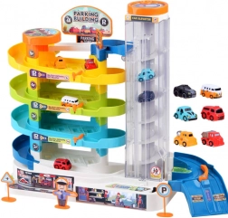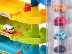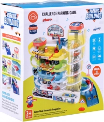 Garage de stationnement multi-niveaux pour enfants avec ascenseur électrique et manuel, pistes en spirale et 6 petites voitures colorées. Inclus: panneaux de signalisation, figurine de gardien et autocollants pour un jeu réaliste. Un excellent choix pour développer les compétences créatives et motrices des enfants.