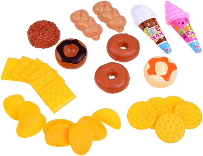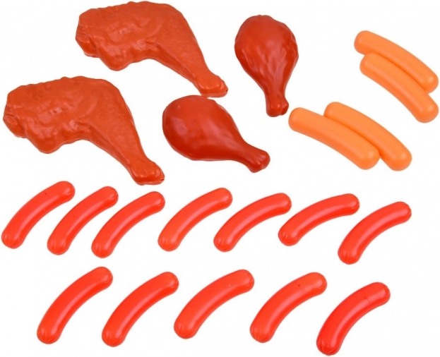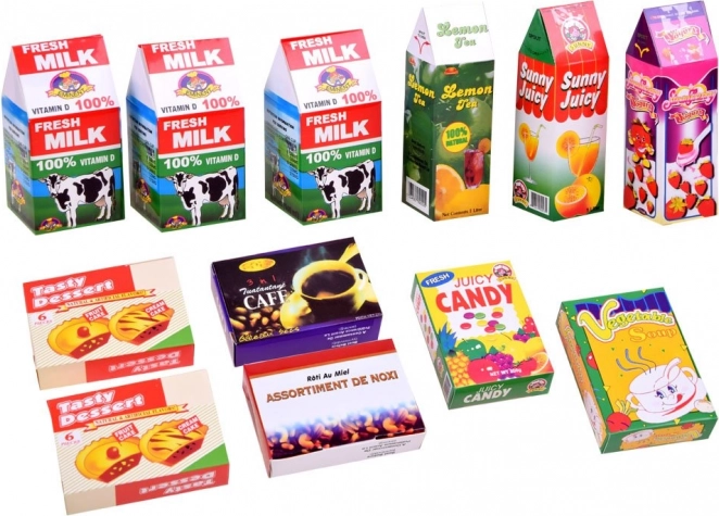 Des pièces fidèlement reproduites comme des pilons de poulet, des saucisses, des glaces, des biscuits ou des briques de jus stimulent la créativité et l’imitation des adultes en cuisine comme au magasin.