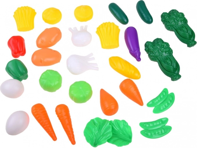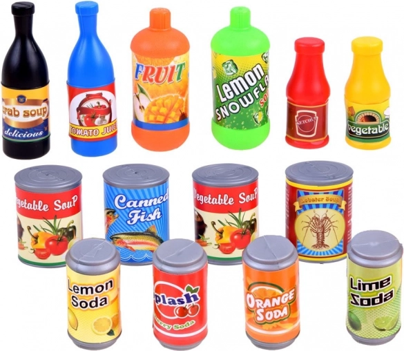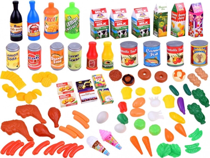 Ce grand set d’aliments de jeu offrira des heures d’amusement dans la cuisine ou le magasin des enfants. Grâce à la large variété – des fruits et légumes aux produits de boulangerie, jusqu’aux boissons et friandises – les petits chefs peuvent préparer des « menus » selon leur imagination et apprendre les bases d’une alimentation saine, des courses et de l’organisation.