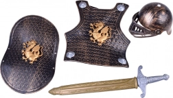 Armure, casque avec visière mobile, bouclier et épée avec fourreau – tout ce dont un jeune chevalier a besoin pour de grandes aventures et des déguisements de carnaval.