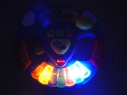 Les touches colorées Do–Ré–Mi déclenchent des notes, des mélodies et des sons de moyens de transport. Le bouton avec la note joue, le bouton vert change, l’orange fait rire.