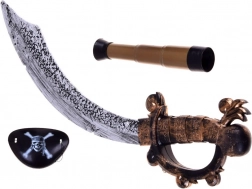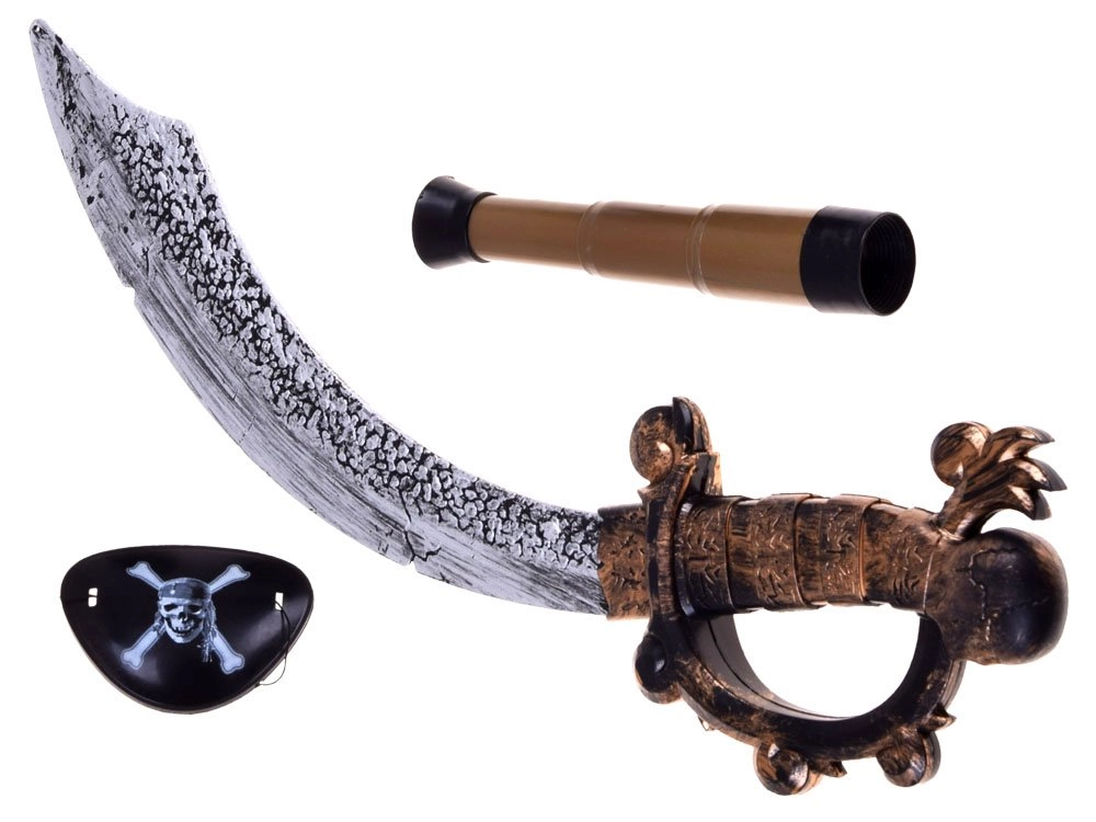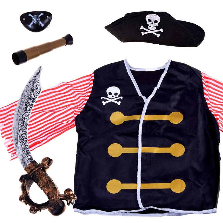 - chapeau de pirate, chemise, épée, longue-vue (télescopique), cache-œil