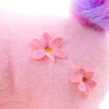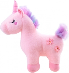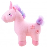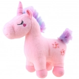 Adorable licorne en peluche aux couleurs pastel, partenaire idéal pour les câlins et le jeu. Elle a un corps tout doux, des yeux brodés, un petit cœur sur la joue et de jolies fleurs sur le flanc. Sa crinière et sa queue arc‑en‑ciel apportent une touche féerique, et la matière agréable est parfaite pour les étreintes des enfants.