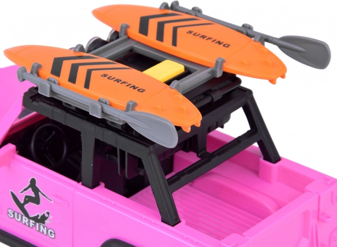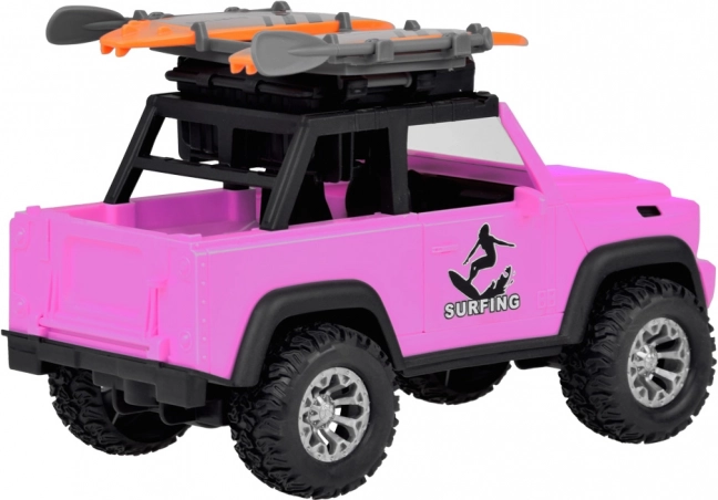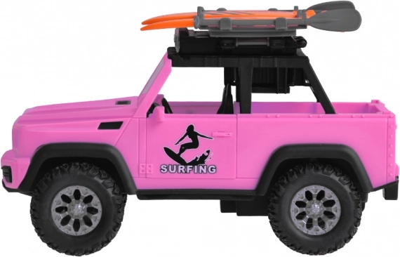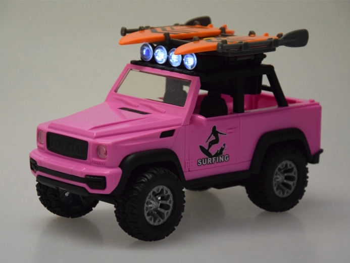 Le 4x4 rose stylé pour de petits aventuriers offre des effets lumineux et sonores, des portes ouvrantes, un couvercle de coffre rabattable et de grandes roues en caoutchouc au profil marqué. Sur le toit, vous trouverez un porte-bagages avec deux planches de surf et un panneau lumineux pour un jeu encore plus réaliste.