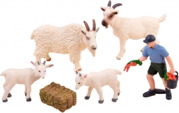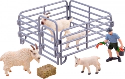 - 2 chèvres adultes, 2 chevreaux, fermier, botte de foin, enclos