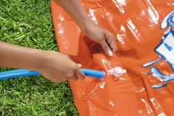 Installation rapide et facile. Il suffit de dérouler le toboggan sur la pelouse et de connecter le tuyau. Des fixations spéciales assurent que le toboggan reste fermement en place.