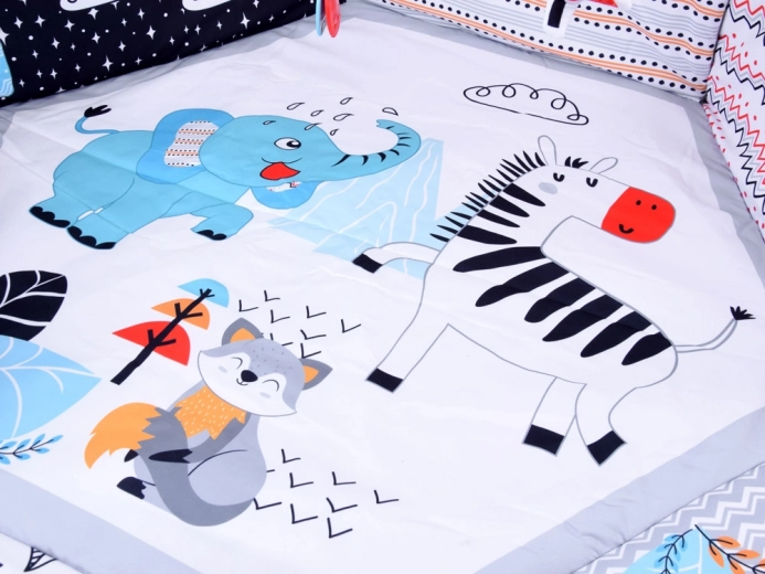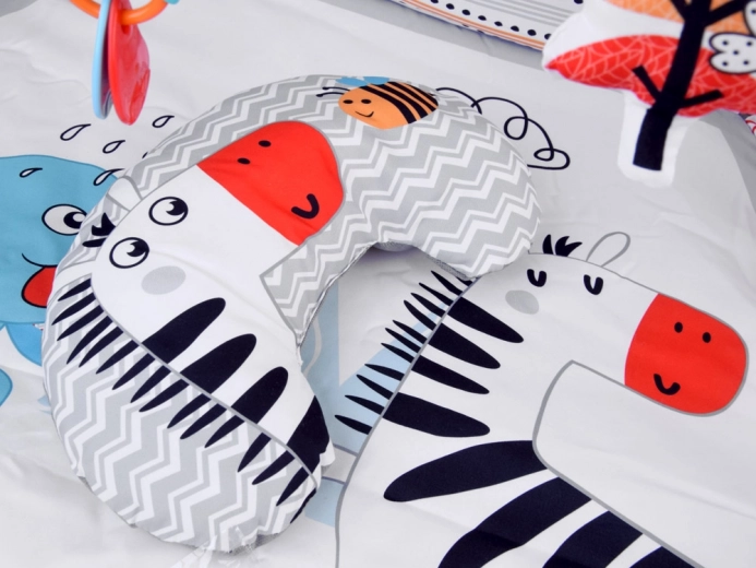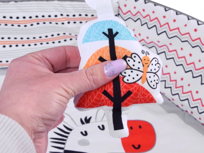 Le set comprend de nombreux éléments ludiques variés, dont des balles en peluche, un petit arbre, un zèbre et un éléphanteau en plastique à fixer sur l’arche, ainsi qu’un filet de rangement pour les balles.