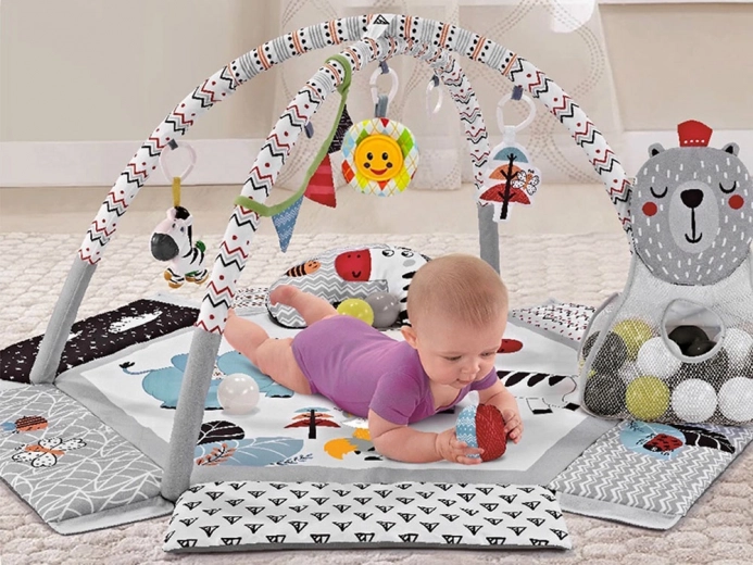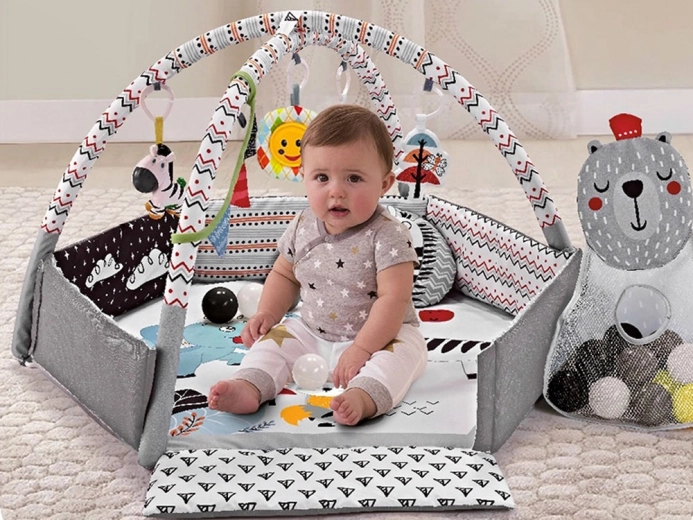 Bébé peut s’allonger sur le dos et attraper les jouets, développant ainsi ses capacités motrices et renforçant les muscles du dos. En refermant le tapis, vous obtenez un parc adapté aux enfants assis ou qui rampent, et les balles incluses décuplent le plaisir.