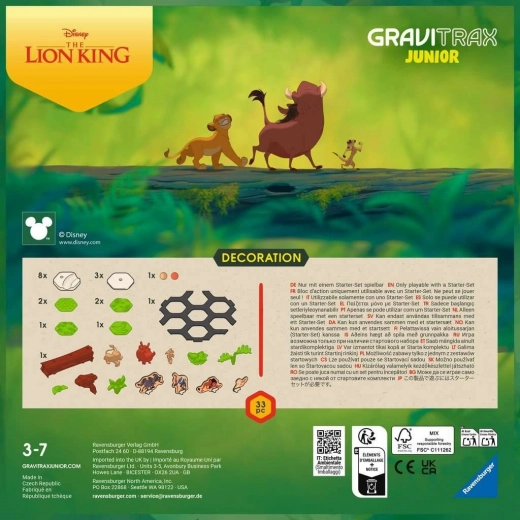 Créez un monde magique pour vos enfants avec l’extension GraviTrax Junior Disney : Le Roi Lion. Le set comprend des figurines de Simba, Pumbaa et Timon ainsi que de riches éléments décoratifs, grâce auxquels vous transformerez votre circuit à billes en un véritable univers du Roi Lion. Il favorise la créativité, la motricité fine et le jeu de rôle, est fabriqué en bioplastique d’origine bois et contient 33 éléments.