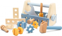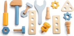 Il comprend 16 pièces fonctionnelles : marteau, tournevis, clé, clous, vis et engrenages pour des possibilités de jeu infinies. Le produit est en bois certifié FSC, un choix durable pour les parents et la planète.