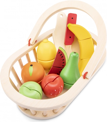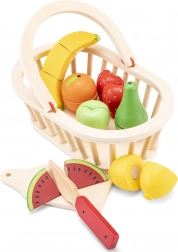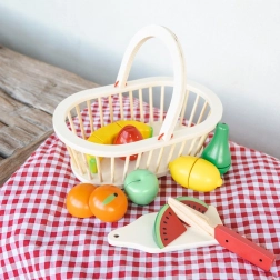 Le set comprend une planche, un couteau en bois sûr et un assortiment de fruits colorés : pastèque, fraise, poire, pomme, citron, banane et orange. Le tout est rangé dans un panier en bois robuste, parfait pour un rangement facile et pour jouer aux courses.