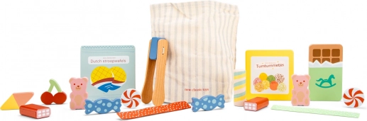 Ce set de confiseries en bois ravira tous les petits fans de jeux de magasin ou de café. Il propose un large choix de douceurs en bois – de la barre chocolatée aux oursons gélifiés – soigneusement réalisés pour paraître plus vrais que nature. Un sac en coton pratique pour le rangement et une pince en bois pour un service amusant sont inclus.