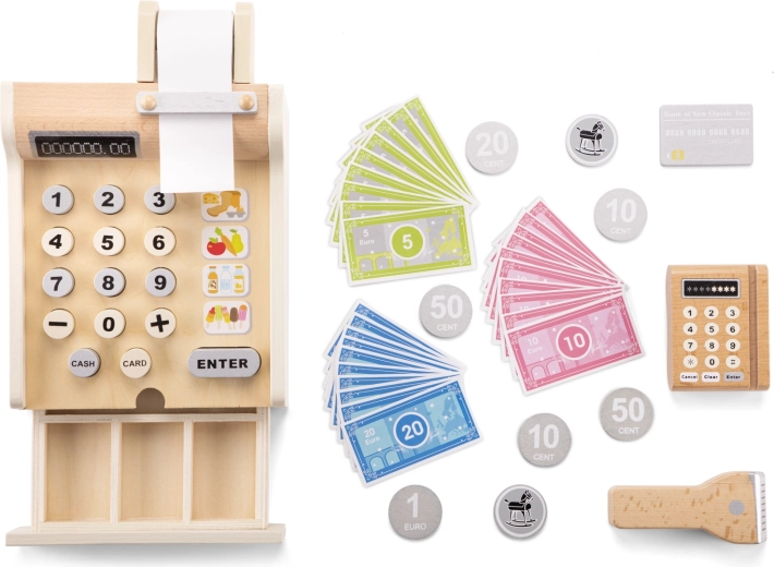 - Caisse avec tiroir, scanner, lecteur de cartes, 30 billets en papier, 8 pièces en bois, carte de crédit