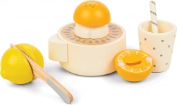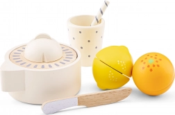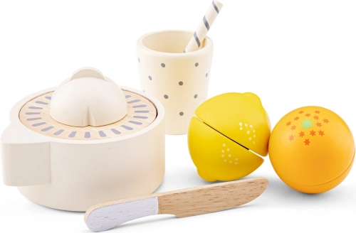 - Presse-agrumes, orange et citron à scratch, couteau en bois, gobelet avec paille