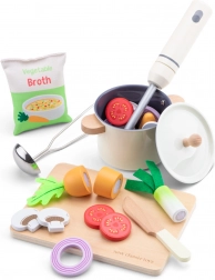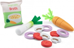 Le set inclut une palette généreuse d’ingrédients : carotte, poireau, oignon rouge, tranches de tomate et de champignons, ainsi qu’un sachet en tissu de « bouillon de légumes ». Les enfants peuvent inventer leurs propres recettes, servir la soupe à la louche et la présenter comme de véritables chefs.