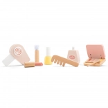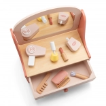 L'ensemble comprend des accessoires en bois tels qu'une brosse, un rouge à lèvres, une bouteille de parfum, un sèche-cheveux, un vernis à ongles, une palette de fards à paupières et un pinceau, encourageant un jeu créatif.