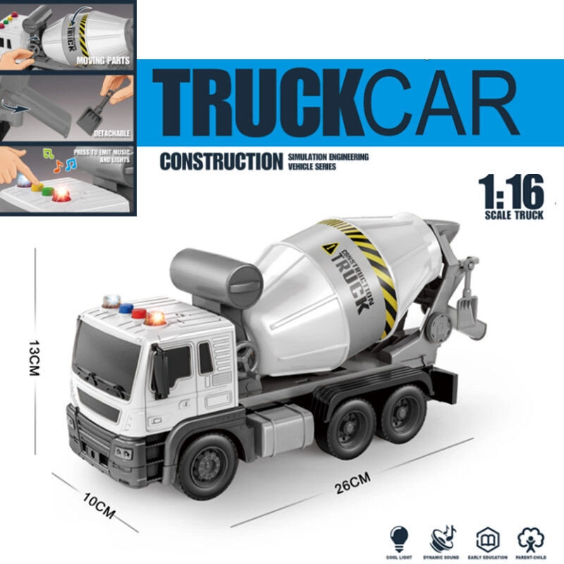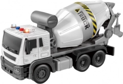 À l’arrière du véhicule se trouve une cuve blanche mobile et rotative, équipée d’une goulotte pivotante. On peut la mettre en mouvement à l’aide d’un bouton placé sur le côté avant. La goulotte est mobile et permet de manœuvrer à droite ou à gauche, et une petite pelle grise est suspendue à l’arrière, pour que tu puisses facilement commencer les travaux sur le chantier jouet. Le jouet est réalisé dans un style très réaliste, avec des autocollants caractéristiques de ce type de véhicule ainsi que de nombreuses imitations de détails importants. Le véhicule est à l’échelle 1:16.
