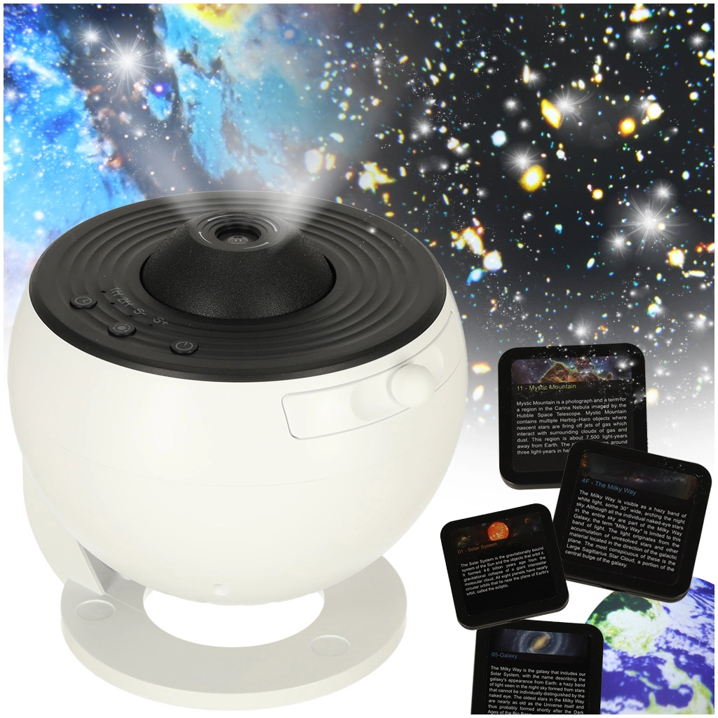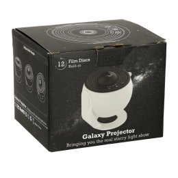 L’emballage comprend 12 disques interchangeables avec descriptions en anglais – par exemple Terre, Système solaire, Voie lactée ou Lune. Le projecteur est ainsi parfait pour apprendre en jouant et éveiller l’intérêt pour l’astronomie chez les enfants comme chez les adultes.
