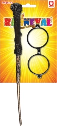 Un set de magicien comprenant une baguette en plastique et des lunettes rondes vous transporte dans le monde de la magie. Accessoire idéal pour toute fête costumée ou Halloween.