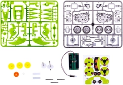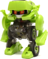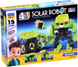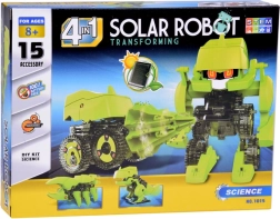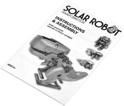 Composants inclus : pièces en plastique pour assembler le robot, panneau solaire, moteur, yeux en plastique, autocollants et guide illustré.