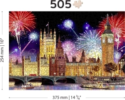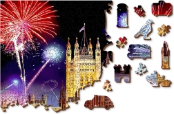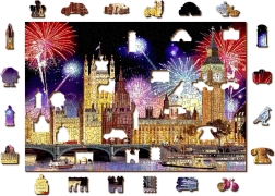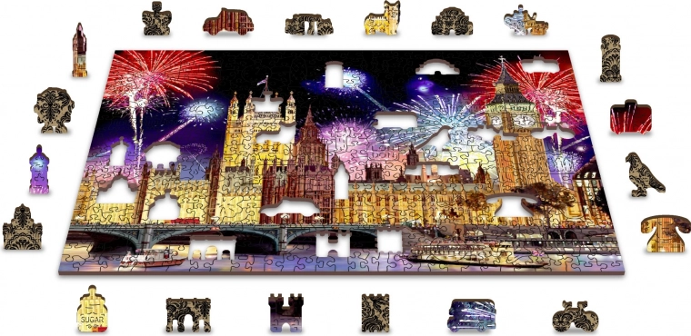 La conception recto-verso 2-en-1 apporte deux défis en un : au recto, vous assemblez un motif coloré de Londres avec feux d’artifice ; au verso, un motif répétitif pour un assemblage guidé par la forme. Même avec un nombre plus réduit de pièces, la variété des découpes rend l’ensemble plus exigeant et plus amusant. Le puzzle est fabriqué en plaque HDF (3–4 mm) et livré dans un emballage écoresponsable sans plastique avec modèle fourni.