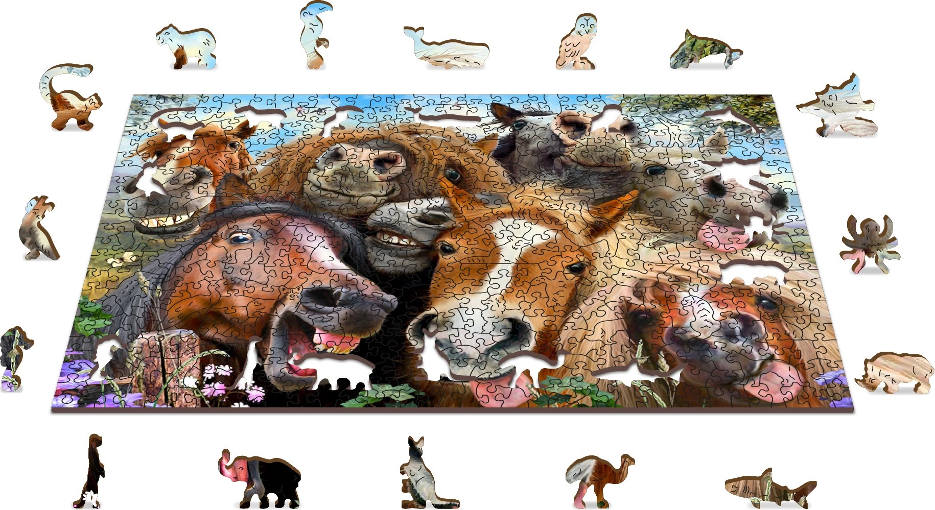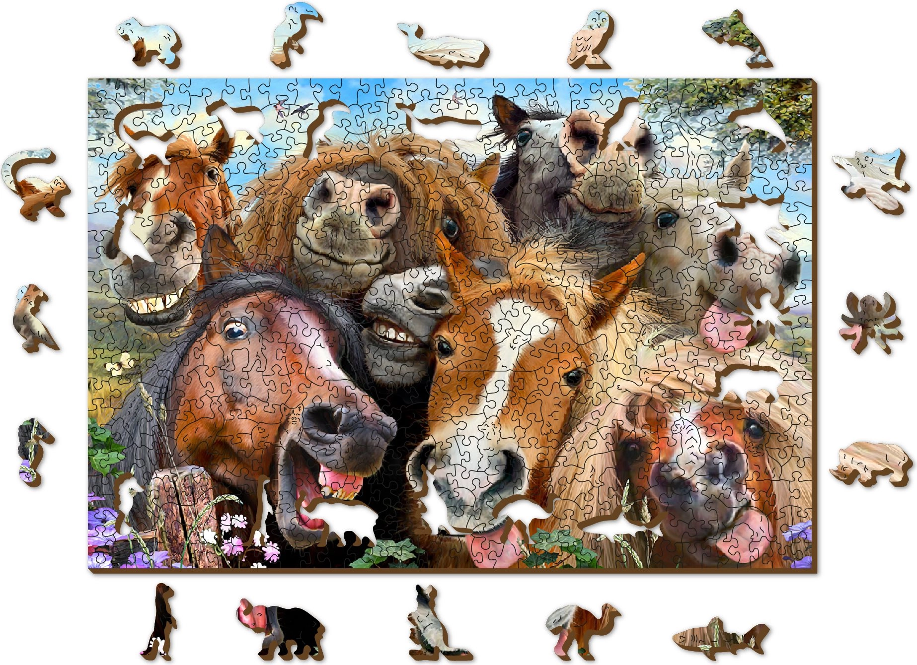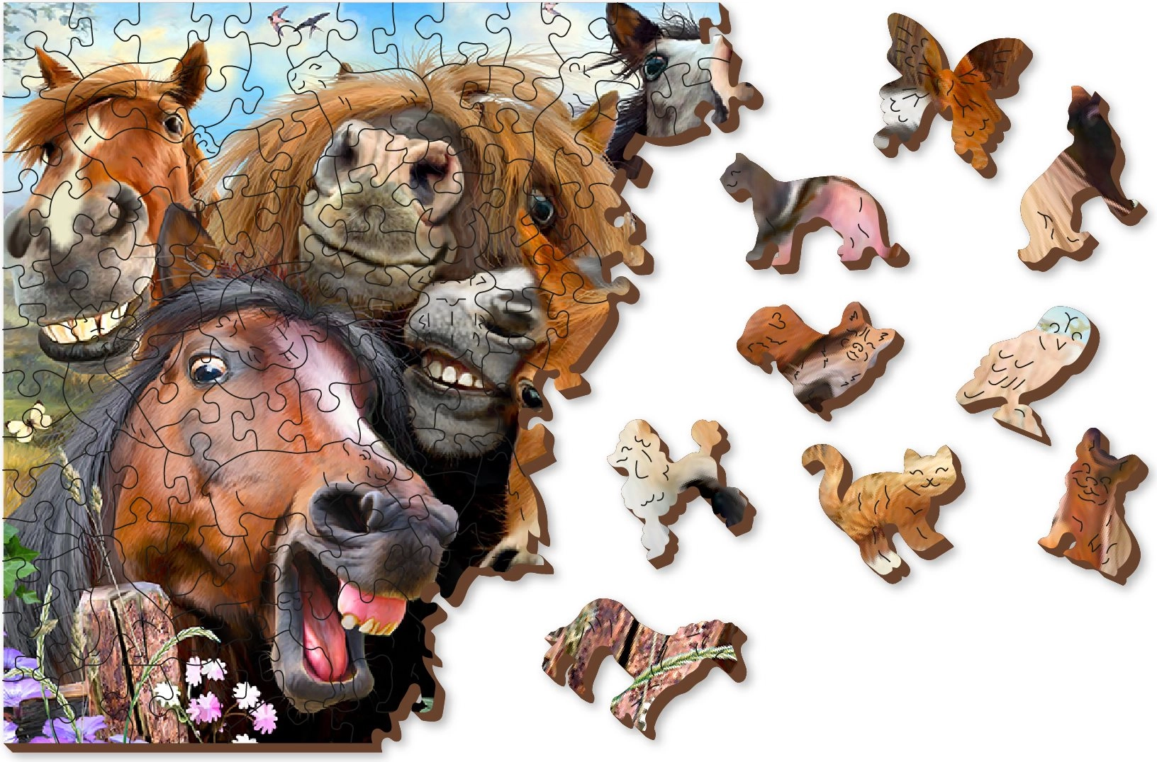 Le puzzle en bois WOODEN CITY « Chevaux tout autour » se distingue par une conception originale avec des détails mis en valeur au laser. Certaines pièces ont des formes d’animaux, de bâtiments et d’objets et peuvent tenir debout comme de petites figurines. Grâce à la variété des formes, l’assemblage offre un défi agréable même aux amateurs de puzzles expérimentés.