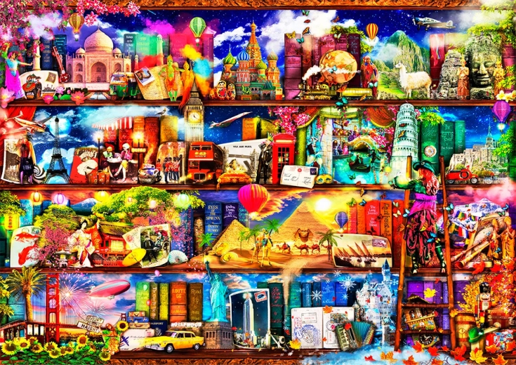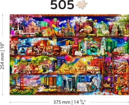Pénétrez dans l’univers des puzzles en bois de précision WOODEN CITY. Ce modèle au motif d’étagère de livres de voyage propose un défi pour les amateurs de casse-têtes : pièces spécialement façonnées, détails marqués au laser et conception double face pour doubler le plaisir. Certaines pièces ont la forme d’animaux, de bâtiments iconiques ou d’objets thématiques – et beaucoup peuvent tenir debout comme de petites figurines.