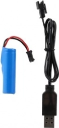 L’emballage inclut une batterie rechargeable et un câble USB pour une recharge aisée. La télécommande nécessite 2× AA (non incluses).