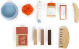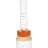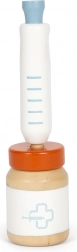 Seringue en bois avec mécanisme à ressort, boîte à médicaments et autres outils pour un jeu d’imitation authentique de soins à l’animal.
