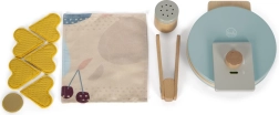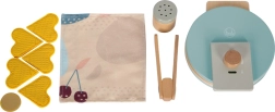 Le set comprend également une serviette en tissu, une pince pour un service en toute sécurité et une sucrière qui émet un agréable son de crécelle lors du saupoudrage. La conception robuste en bois aux couleurs modernes et aux matériaux agréables est idéale pour la cuisine des enfants.