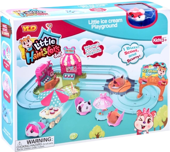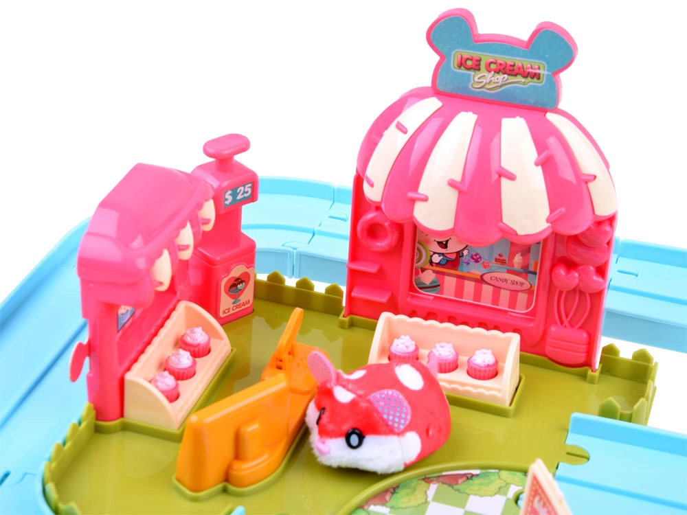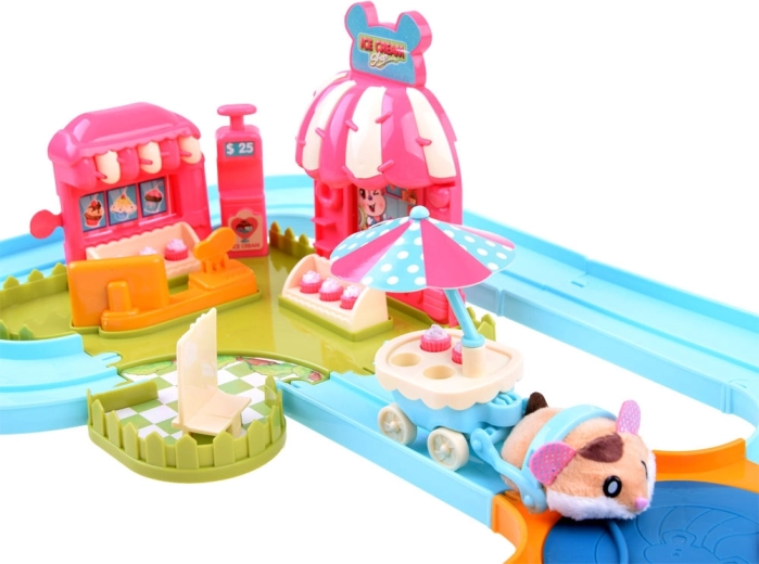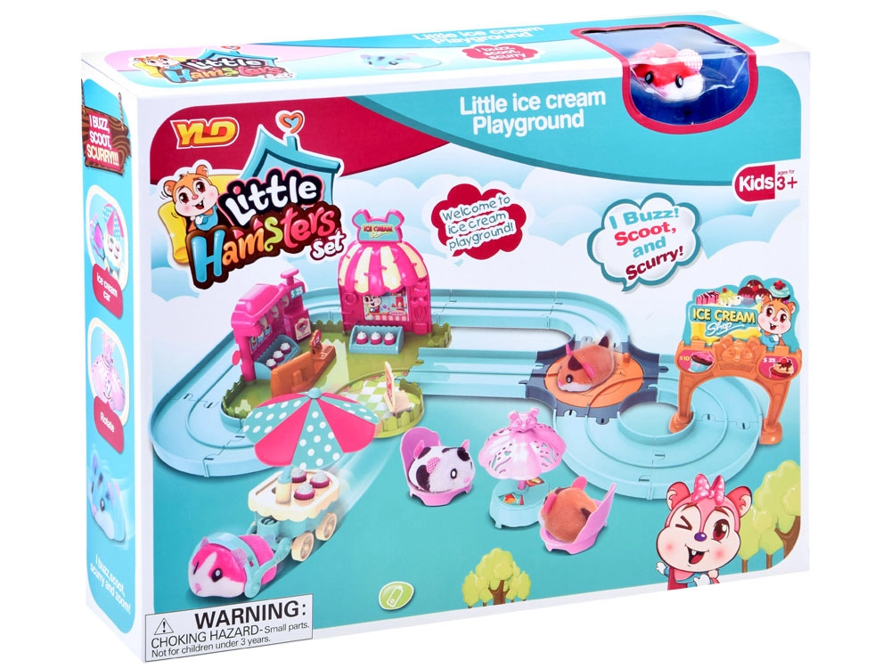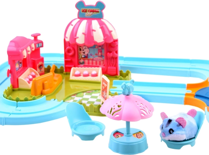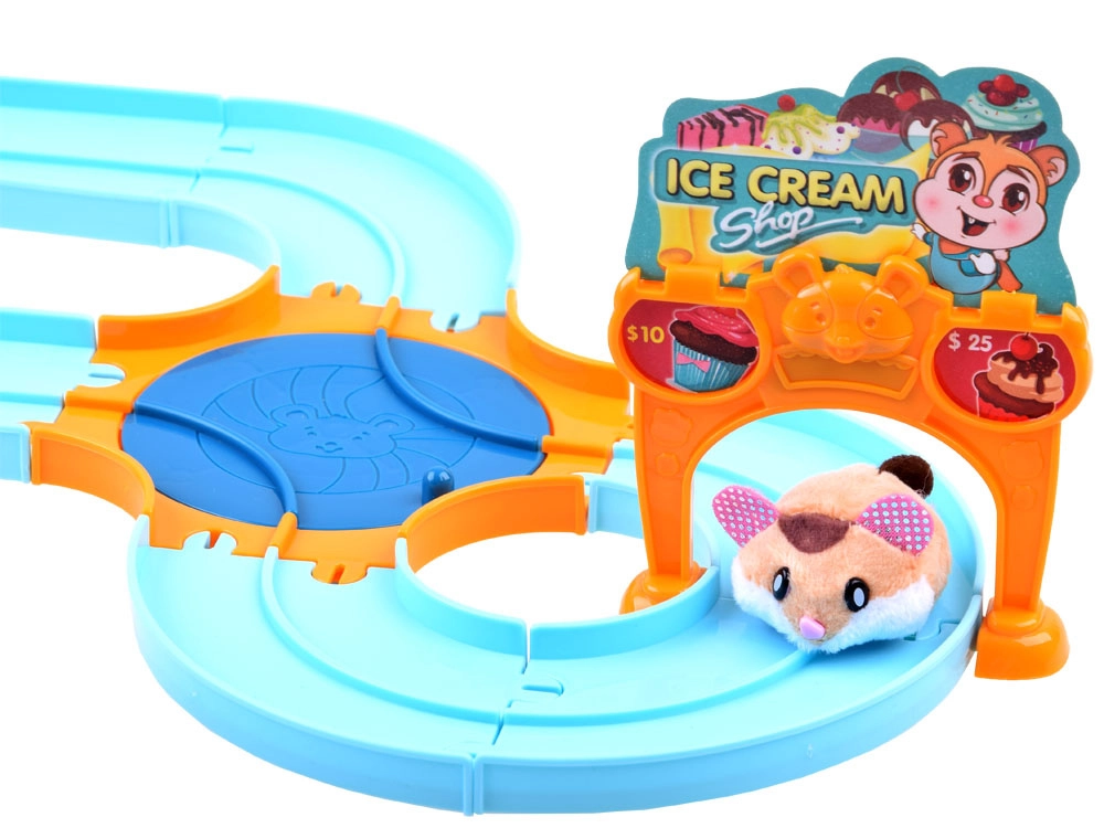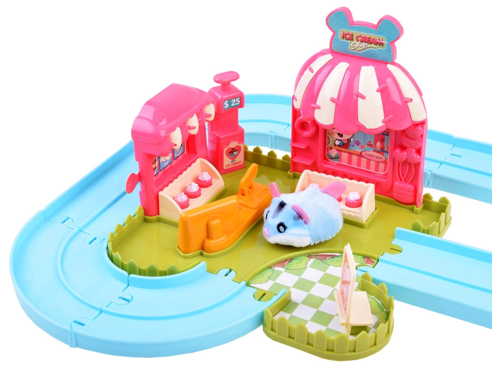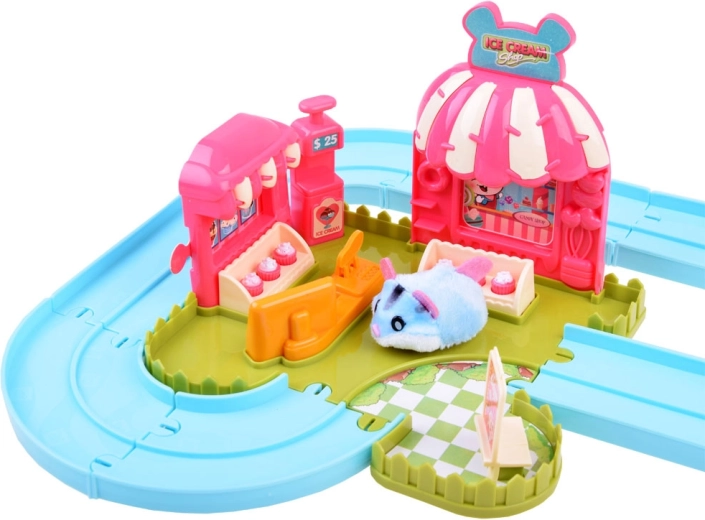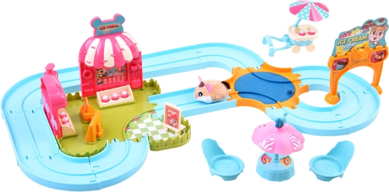 Ce set de jeu apporte l’univers amusant d’une gelateria avec un adorable hamster au pelage tout doux, prêt à l’action dès le déballage – alimenté par une pile AG13 (incluse). Une fois allumé, le hamster se met à rouler, change de direction tout seul et peut être guidé sur la piste facile à assembler avec aiguillage. Avec le chariot, il distribue des gourmandises aux invités.