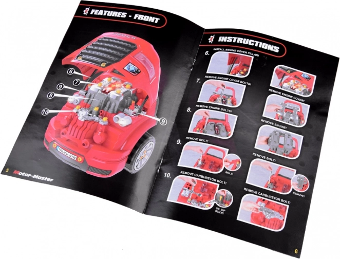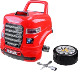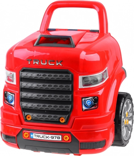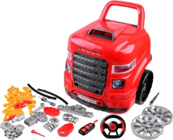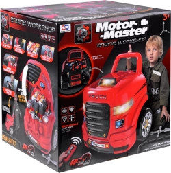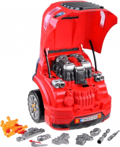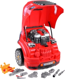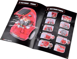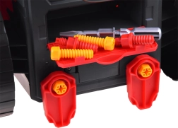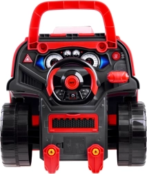 Ce garage portable en rouge et noir transforme chaque enfant en mécanicien malin. Sous le capot l’attend un moteur en plastique détaillé, qui peut être démonté et remonté. Dans la cabine, on trouve un volant avec klaxon, un levier avec modes P/R/N, un bouton start/stop et un espace de rangement pour les petits objets. Les phares avant s’illuminent en blanc et sont accompagnés d’effets sonores.
