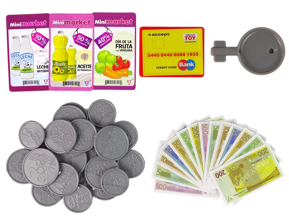 Comprend divers accessoires ludiques, tels que des bouteilles d’aliments, des cartes de paiement et différentes coupures et pièces de monnaie.