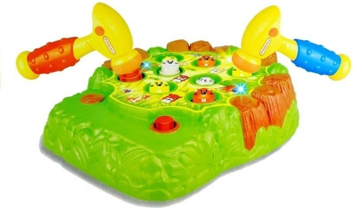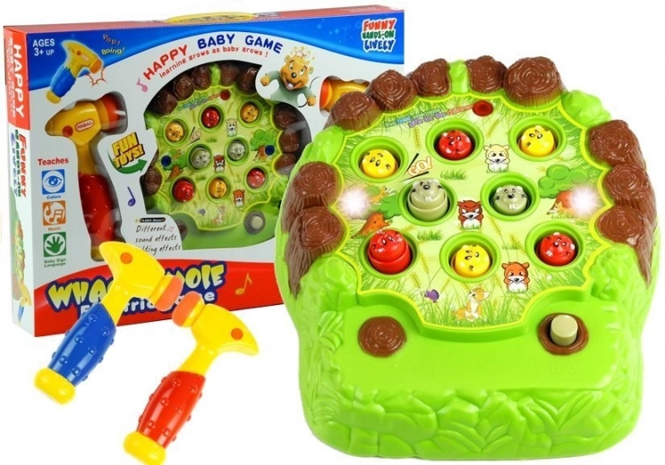 Le set comprend un plateau en plastique vert et marron avec des têtes d’animaux colorées et deux marteaux, permettant à deux joueurs de jouer en même temps. Les graphismes colorés d’animaux et de plantes sur le plateau captiveront chaque enfant, qui ne se lassera jamais de ce jeu. Les enfants s’amusent tout en acquérant de nouvelles compétences, comme la reconnaissance des couleurs et des sons.
