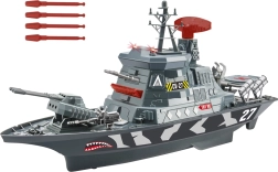 Partez pour une mission d’aventure avec un bateau militaire riche en détails, qui plonge les enfants dans l’univers de la marine. Quatre boutons de commande déclenchent différentes combinaisons d’effets lumineux et sonores — bruit de la mer, tirs, alarme et voix du capitaine en anglais. Le radar rotatif s’illumine pour plus de réalisme, tandis que la plateforme d’atterrissage à l’arrière, l’ancre à l’avant et les armes mobiles encouragent la création de scénarios de bataille.