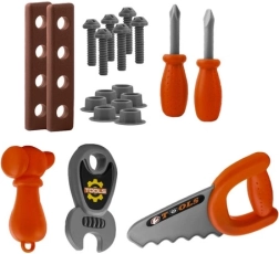 - L'ensemble comprend divers outils, y compris une clé, un marteau et une scie, qui imitent de véritables équipements.