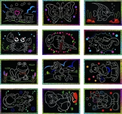 Ce set d’images à gratter est un excellent choix pour une première activité manuelle. Le principe simple consistant à gratter l’intégralité du motif sans détails complexes est facile à comprendre pour les enfants, qui voient immédiatement le résultat : de belles images pailletées et colorées aux reflets éclatants.