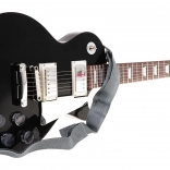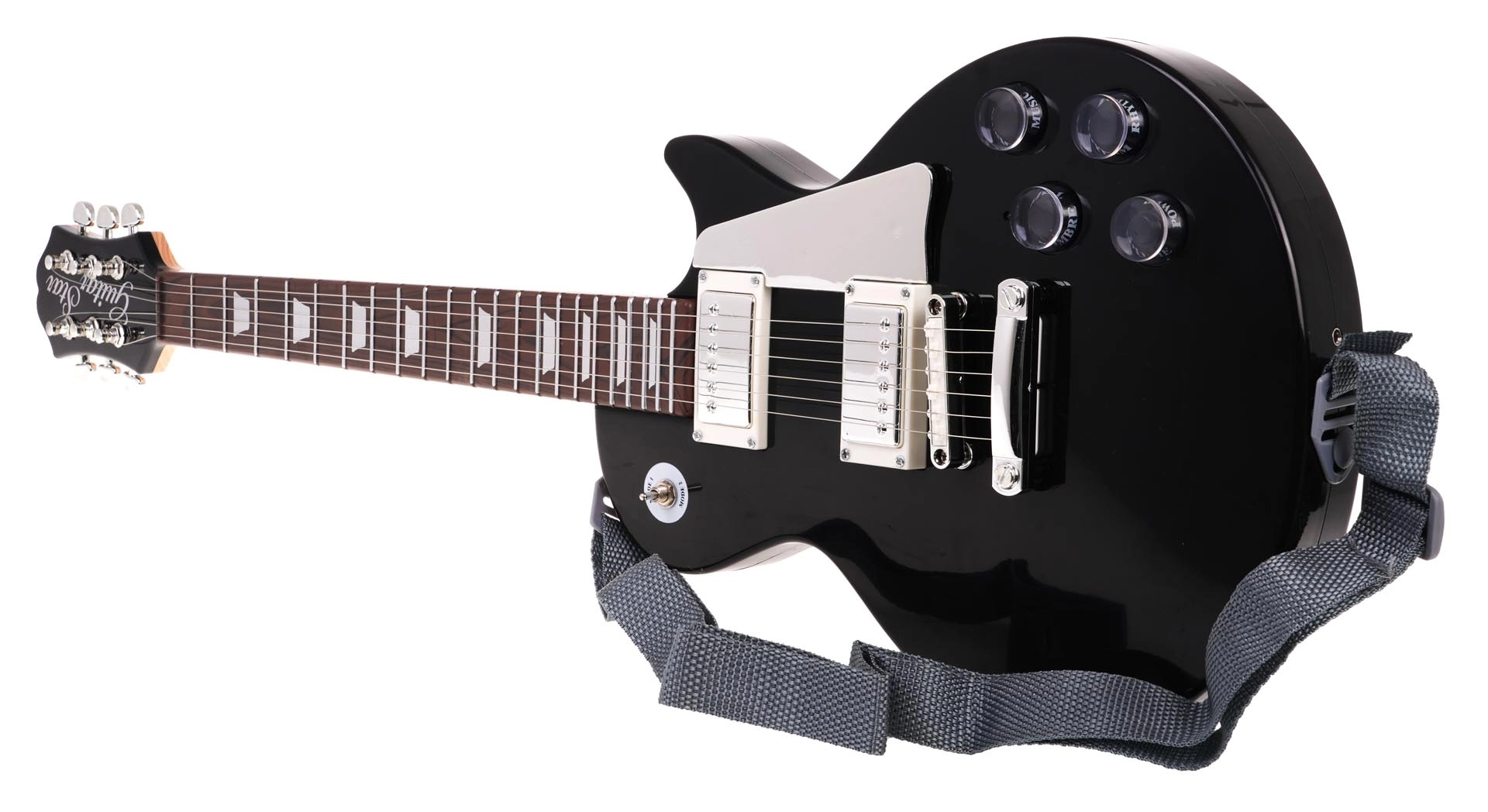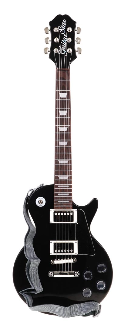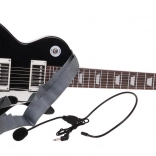 - guitare électrique noire, micro-casque, sangle