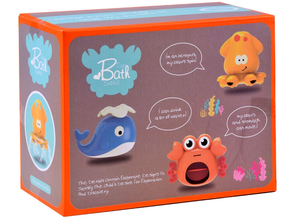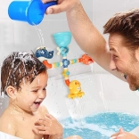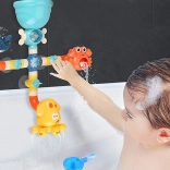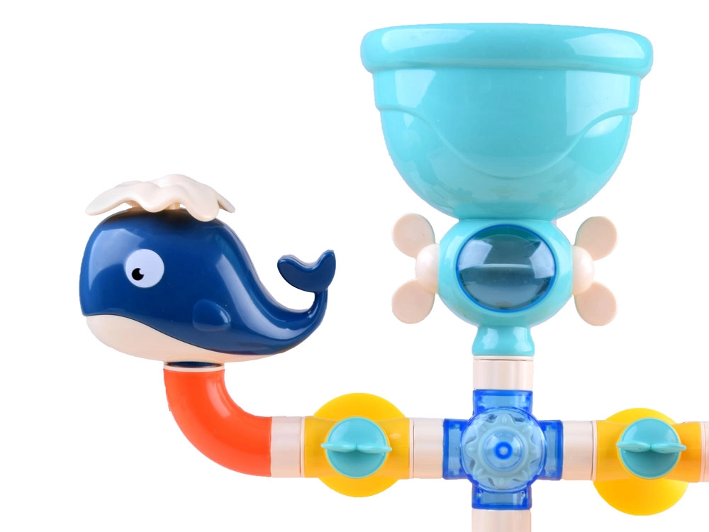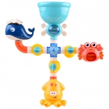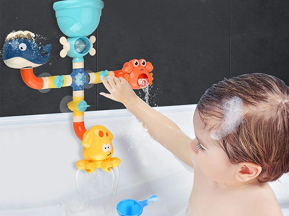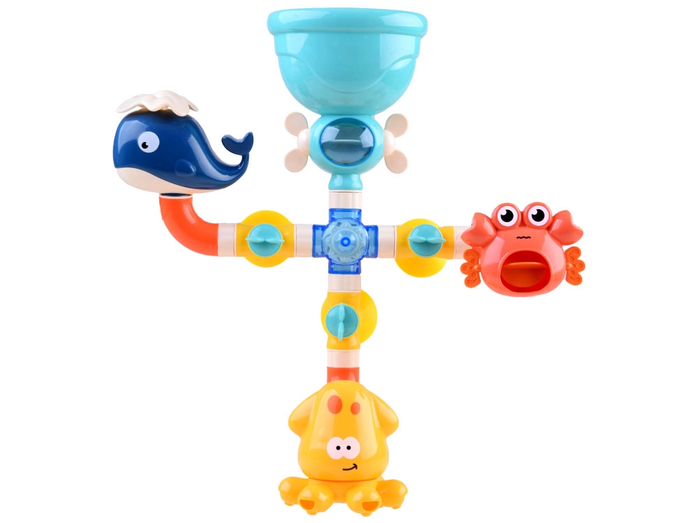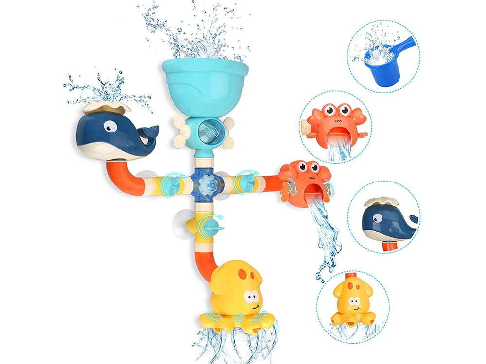 Ce set d’eau interactif transforme chaque bain en moment de jeu. Versez de l’eau dans l’entonnoir supérieur et observez le flux parcourir les tuyaux, faire tourner les éléments et créer des fontaines et cascades. Les pièces à motifs pieuvre, baleine et crabe se réorganisent facilement pour composer de nouveaux parcours.
